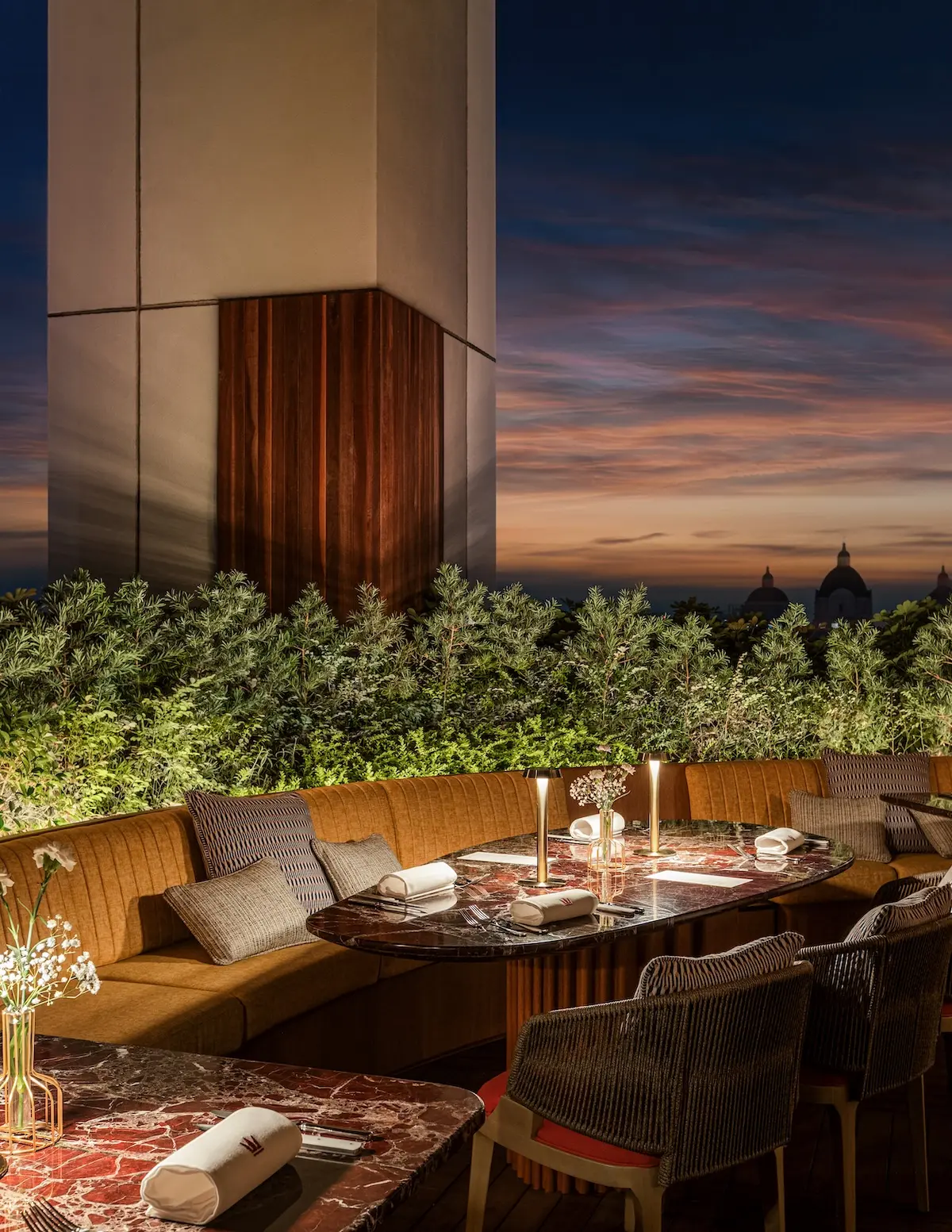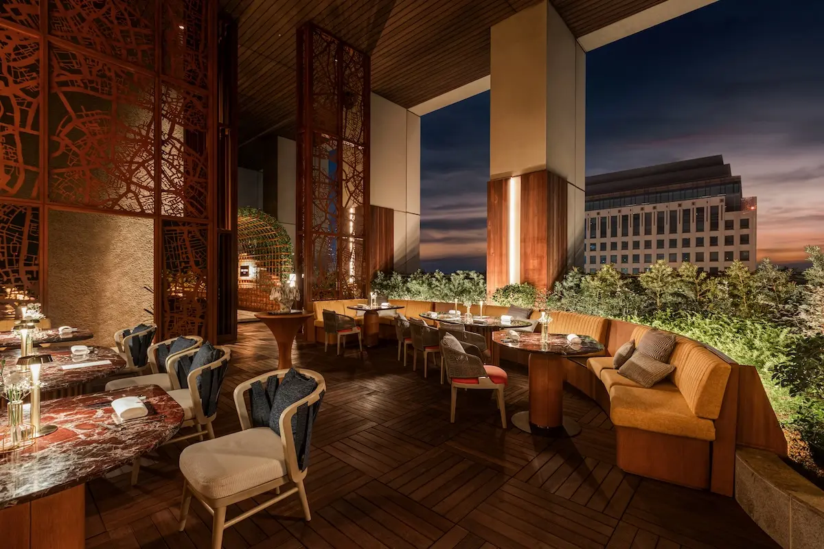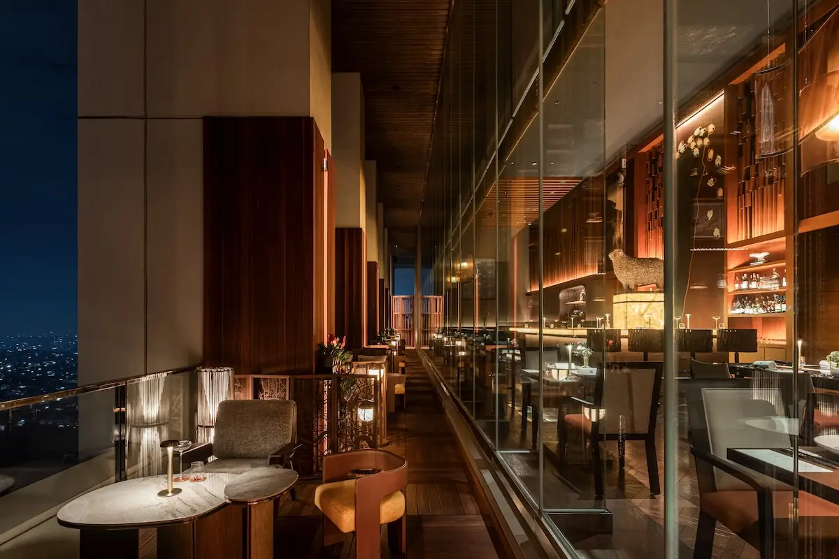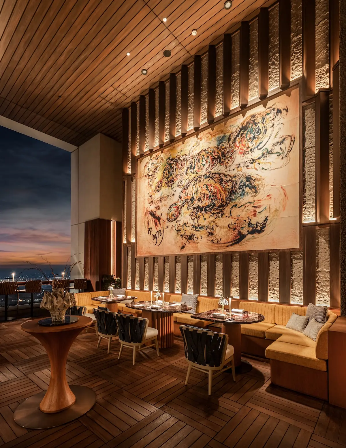 With sweeping city views as a defining feature, the night skyline is treated as a backdrop to the lighting design. Interior lighting is deliberately kept restrained, ensuring it does not interfere with the food, conversation, or the view.